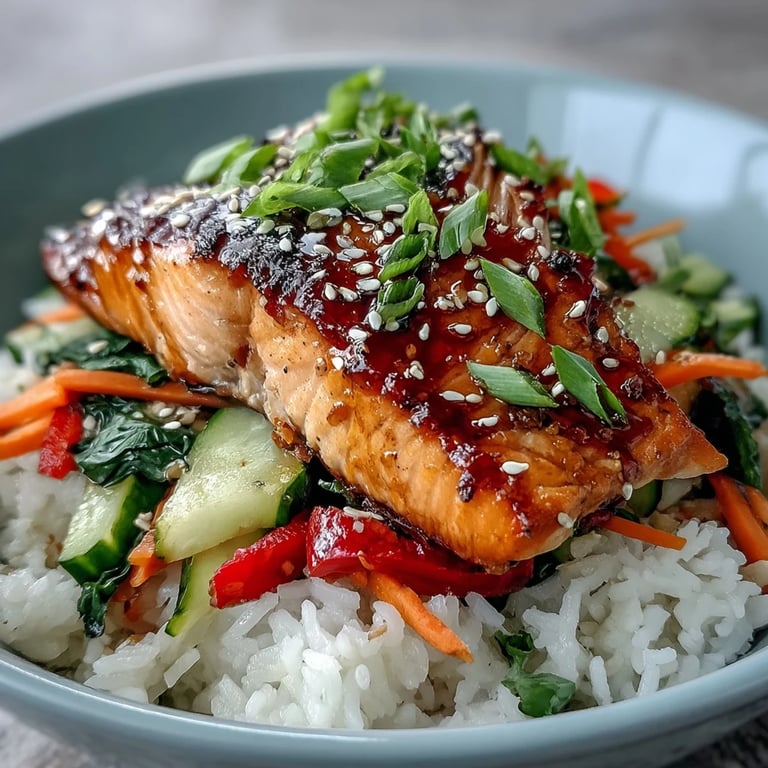 Feel free to customize with shredded cabbage, snap peas, steamed broccoli, or roasted sweet potato. Pickled vegetables like radishes or carrots add tangy contrast. The key is maintaining a variety of textures and colors that complement the glazed salmon.