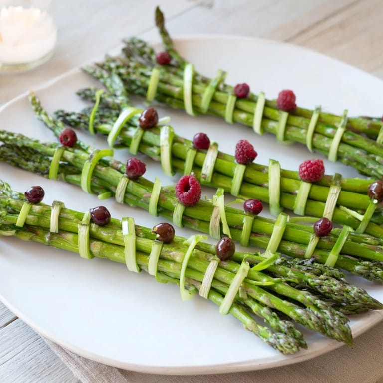 Save I discovered this dish by accident while staring at a farmers market haul on a Sunday morning, struck by how the asparagus and chives seemed to call out for something architectural. There's something about spring produce that makes you want to build with it rather than simply plate it. The moment I wove those first stalks together and nestled berries into the gaps, I knew I'd stumbled onto something that felt both playful and elegant—the kind of dish that makes people pause before they eat it.