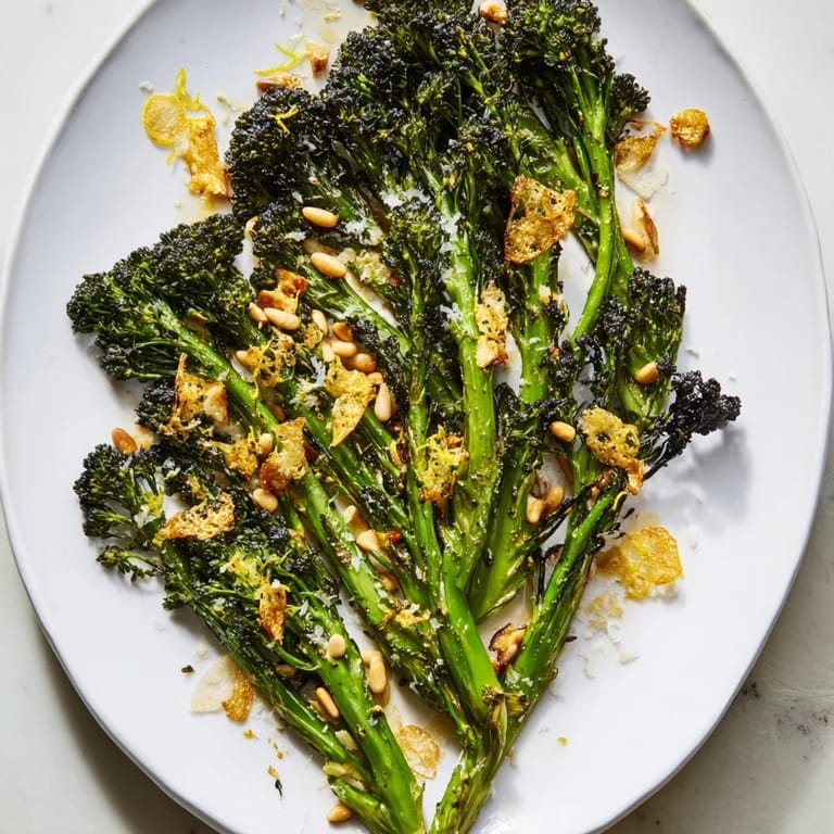 This works as a vegetable side for grilled fish or roasted chicken, sits beautifully on a spring brunch table, or honestly stands alone as a light lunch if you're eating it for one. I've served it at room temperature the next day and it's still good, though the garlic chips lose some crispness—a good reminder that this is really meant to be eaten fresh. For a vegan version, skip the Parmesan and use toasted breadcrumbs or more pine nuts for that savory, crunchy element.