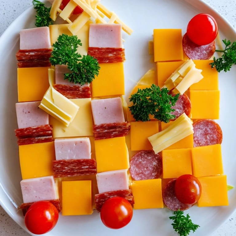 - Arrange cheese and meat slices on your serving platter in a tight 4x4 grid, alternating colors and types so the pattern reads clearly from across the room. This is your foundation, so spend a moment getting it right.