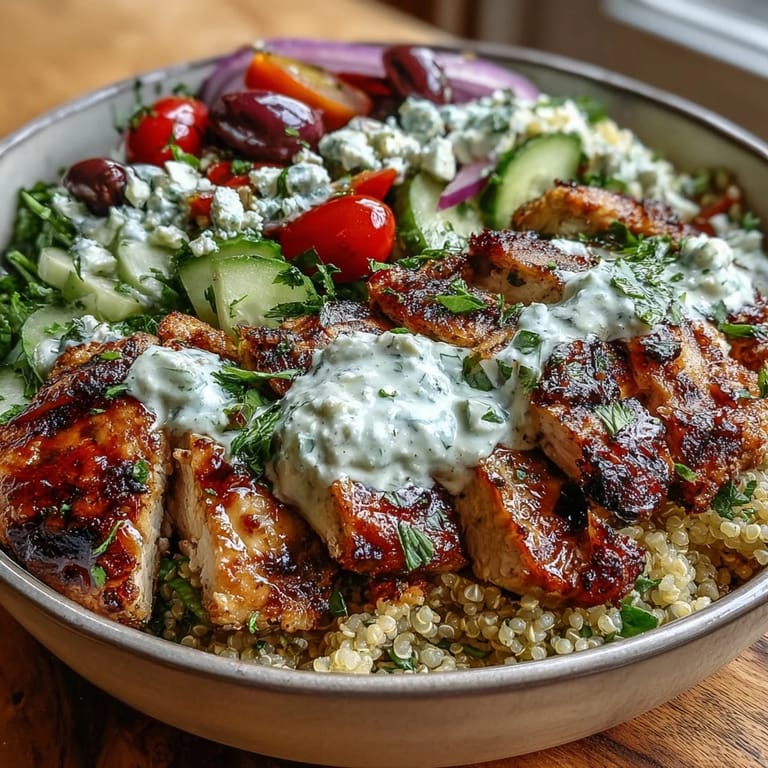 Save This bowl is designed for those who crave a meal that is both light and satisfying. The combination of warm, grilled chicken and chilled vegetables creates a delightful contrast, while the homemade tzatziki sauce adds a rich, garlicky finish that ties all the components together beautifully.