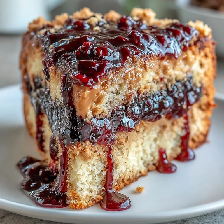 Save My sister once challenged me to reimagine childhood classics in dessert form, and this cake was born from that conversation over coffee. She'd been craving the simplicity of peanut butter and jelly on bread, but wanted something that felt like an occasion. The first time I pulled this from the oven, the kitchen smelled like roasted peanuts and tart berries, and I knew I'd stumbled onto something that would become a regular request. There's something deeply satisfying about deconstructing a sandwich into layers of cake and sauce.