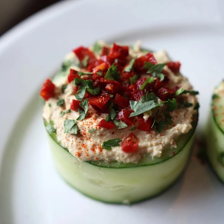 Save These bites combine the crunch of cucumber with the smooth, flavorful hummus, enhanced by colorful toppings like roasted red pepper and kalamata olives. Their simplicity makes them a great canvas for creativity, whether you want to add a smoky paprika finish or a sprinkle of toasted sesame seeds.