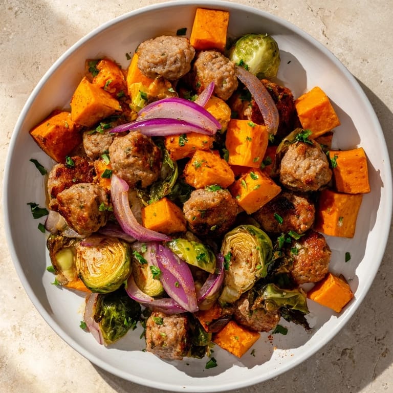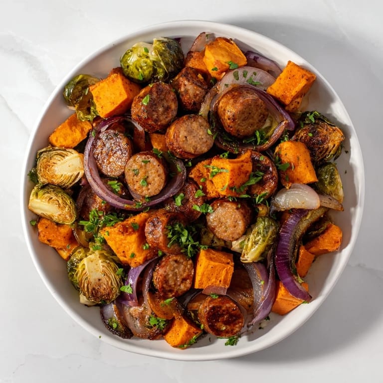 Save A hearty, colorful sheet pan meal featuring savory sausage, caramelized sweet potatoes, and roasted Brussels sprouts—easy, healthy, and perfect for busy weeknights.