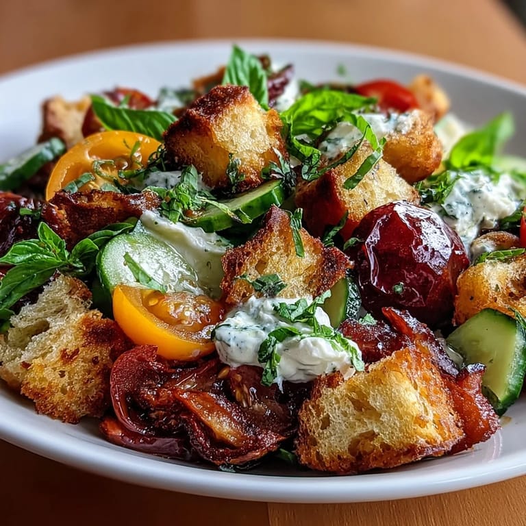 Save My neighbor brought over a basket of heirloom tomatoes one August afternoon, and they were so beautiful I couldn't bear to simply slice them. I had some day-old sourdough on the counter and a bunch of basil going wild on the porch, so I started tossing things together without much of a plan. What emerged was this salad that tastes like summer itself, where the bread soaks up all those juices and the vinaigrette ties everything together in the most effortless way.